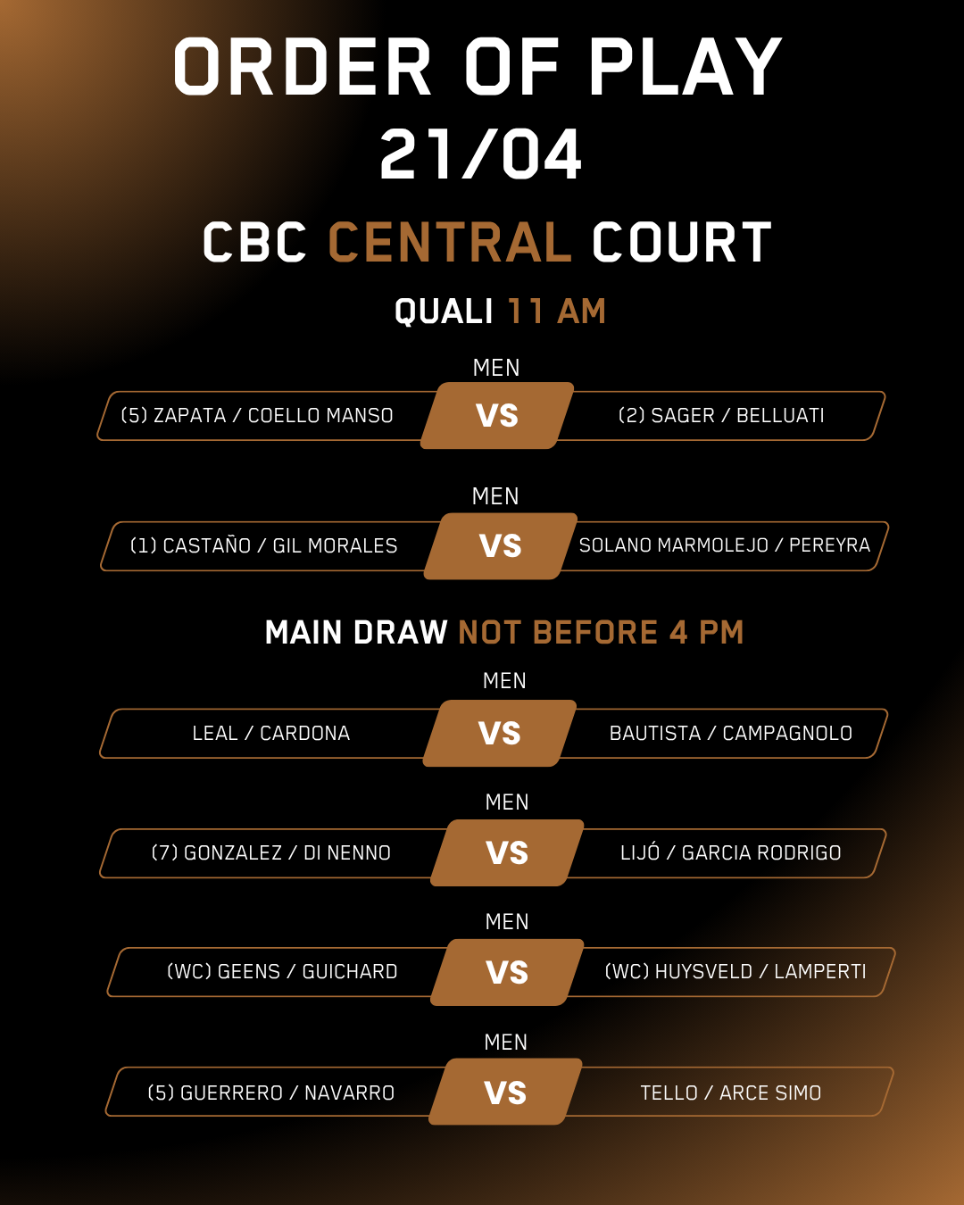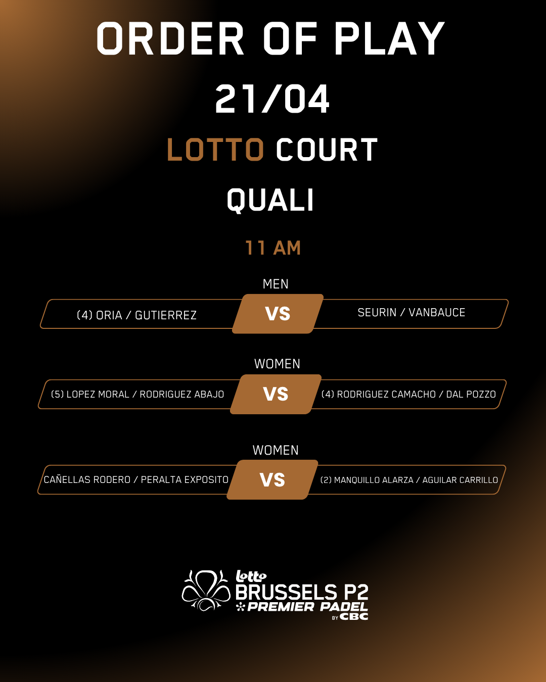 Daily program Your Day at the Lotto Brussels Premier Padel P2 by CBC Check out today’s line-up for the CBC Central Court, Lotto Court and Nextensa Court. CBC Central Court Nextensa Court Lotto Court